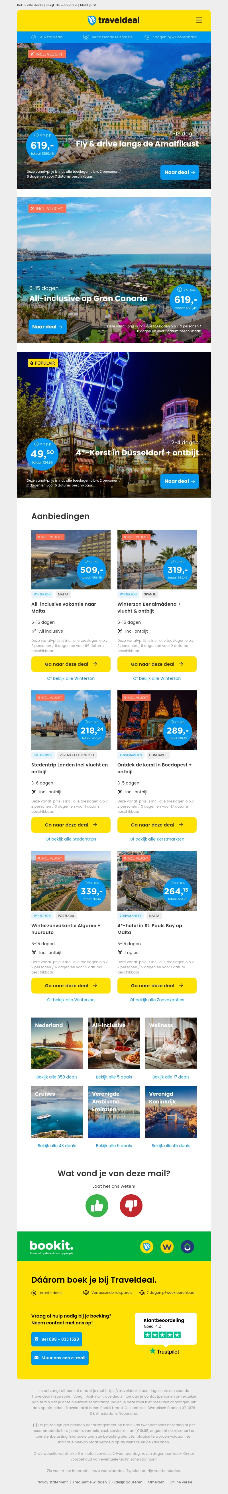 Mis deze kans niet om te genieten van een onvergetelijke reis langs de prachtige Amalfikust met ons fly & drive arrangement. Of kies voor een ontspannen all-inclusive vakantie op het zonnige Gran Canaria. Beide opties bieden luxe en avontuur voor een geweldige prijs van slechts €619 per persoon. Bekijk ook andere bijzondere deals, waaronder Kerst in Düsseldorf en citytrips naar Londen en Boedapest.