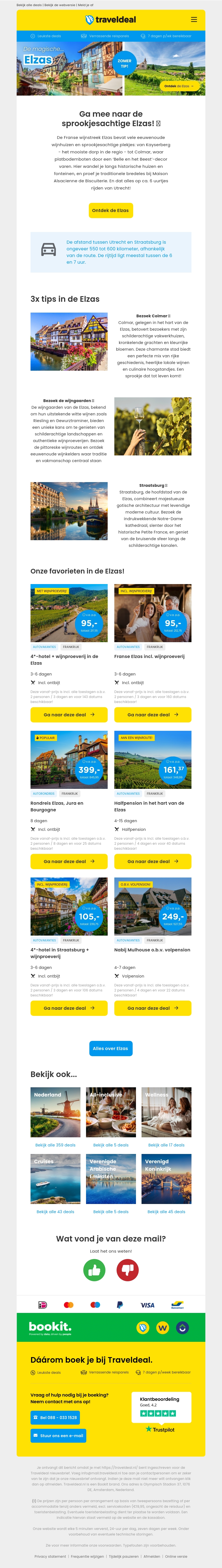 De Franse wijnstreek Elzas biedt een uitzonderlijke ervaring vol schilderachtige wijngaarden en sprookjesachtige dorpjes zoals Kayserberg. In deze nieuwsbrief presenteren we drie geweldige tips voor je bezoek aan de Elzas, inclusief wijnproeverijen en stadswandelingen. Ervaar het beste van deze betoverende regio met Traveldeal.