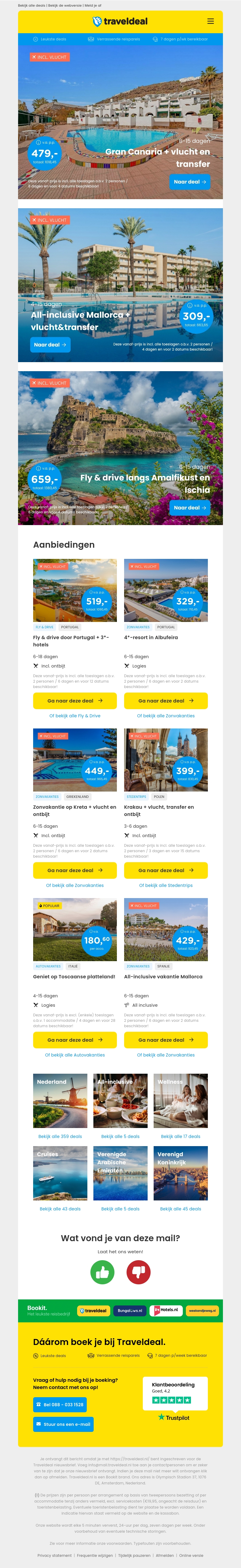 Deze nieuwsbrief van Traveldeal biedt geweldige aanbiedingen voor reizen naar Gran Canaria inclusief vlucht en transfer vanaf €479 per persoon. Daarnaast zijn er deals voor all-inclusive in Mallorca, fly & drive langs de Amalfikust, en nog veel meer. Geniet van zonnige vakanties, avontuurlijke trips en luxe resorts met deze exclusieve deals. Mis deze kans niet om je volgende vakantie voordelig te boeken!