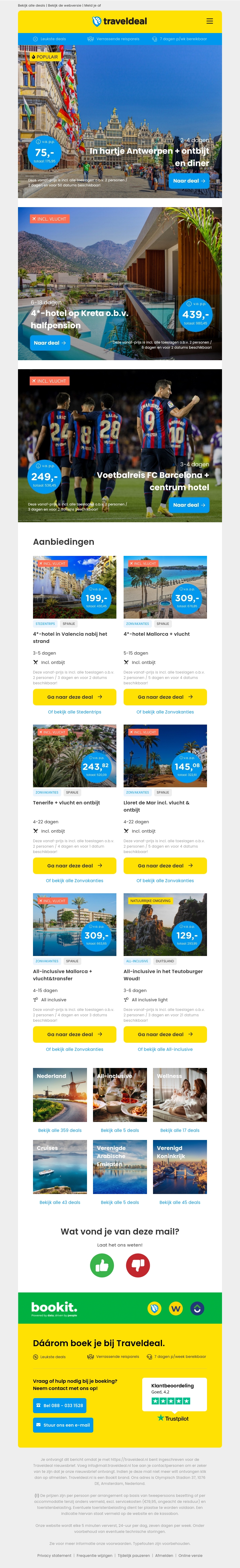 Geniet van een verblijf in hartje Antwerpen inclusief ontbijt en diner vanaf €75 per persoon. Of kies voor een 4-sterren hotel op Kreta met halfpension vanaf €439 per persoon. Daarnaast bieden we nog meer aantrekkelijke deals, zoals voetbalreizen en all-inclusive vakanties in Mallorca.