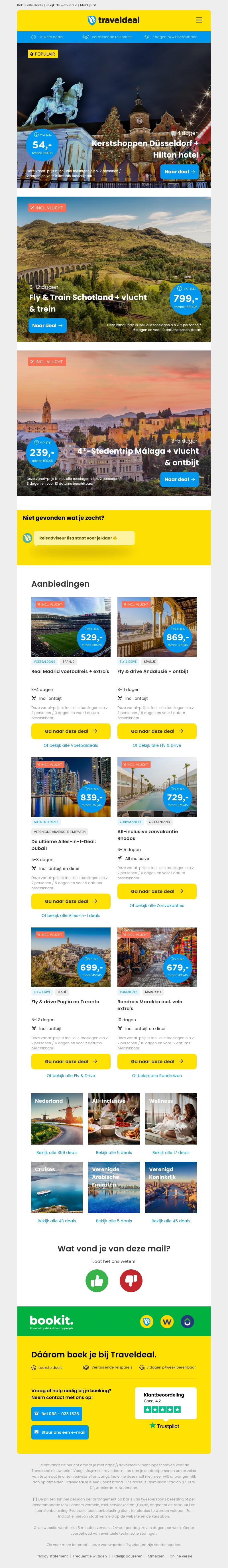 Ontdek de magie van kerstmarkten en stedentrips met onze exclusieve aanbiedingen! Van kerstshoppen in Düsseldorf tot een Fly & Train avontuur in Schotland, we hebben voor ieder wat wils. Boek nu je volgende reis met Traveldeal en bespaar op schitterende bestemmingen.