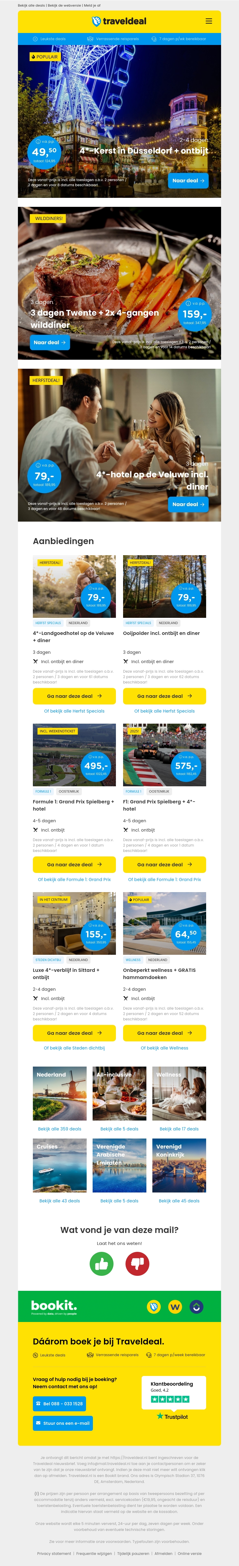 Deze nieuwsbrief biedt spannende reismogelijkheden, met kerstmarkten vanaf €49,50 per persoon en luxe wildarrangementen vanaf €159 per persoon. Er zijn diverse aanbiedingen beschikbaar, waaronder 3 dagen Twente met een wilddiner, en een 4-sterren hotel op de Veluwe inclusief diner. Mis de exclusieve Formule 1 en wellness deals niet. Ontdek jouw perfecte uitje deze winter.