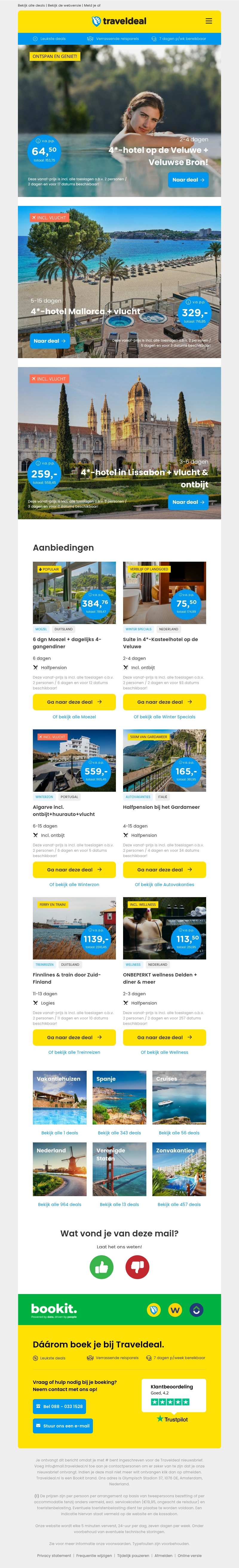 Ervaar de rust van de Veluwe met toegang tot de Veluwse Bron of reis naar het zonnige Mallorca voor een onvergetelijke 4-sterren vakantie. Ontdek aantrekkelijke deals en geniet van luxe accommodaties met geweldige kortingen. Boek direct jouw ideale vakantie en profiteer van de beste aanbiedingen.