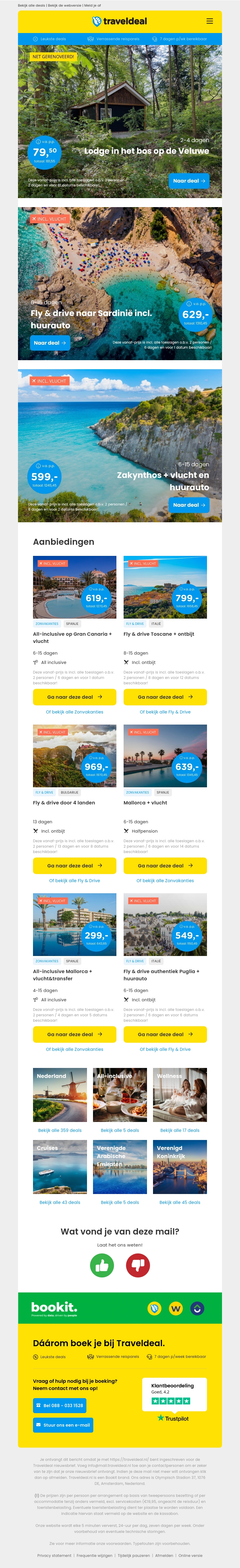 Ervaar de ultieme natuurbeleving met een verblijf in een lodge in het bos op de Veluwe vanaf €79.50 per persoon. Ontdek ook andere geweldige aanbiedingen zoals Fly & Drive naar Sardinië en Zakynthos. Geniet van onvergetelijke vakanties met Traveldeal, inclusief aantrekkelijke kortingen en extra’s.