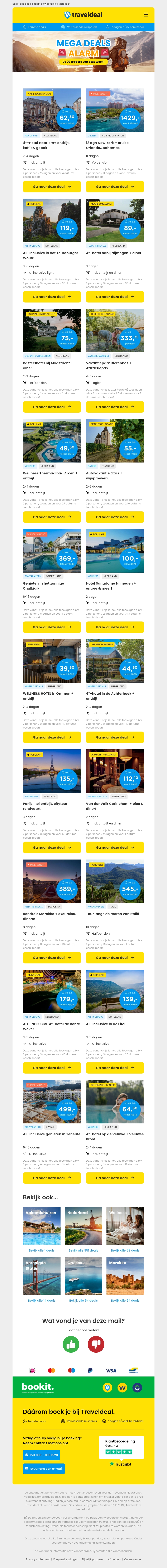 Deze week presenteren we de top 20 mega deals die je niet wilt missen! Van ontspanning in Bad Arcen tot avonturen in Vakantiepark Dierenbos, er is voor ieder wat wils. Maak je klaar voor een onvergetelijke reis naar exotische bestemmingen zoals Marokko en vele andere. Wacht niet te lang, deze aanbiedingen zijn te goed om te laten schieten!