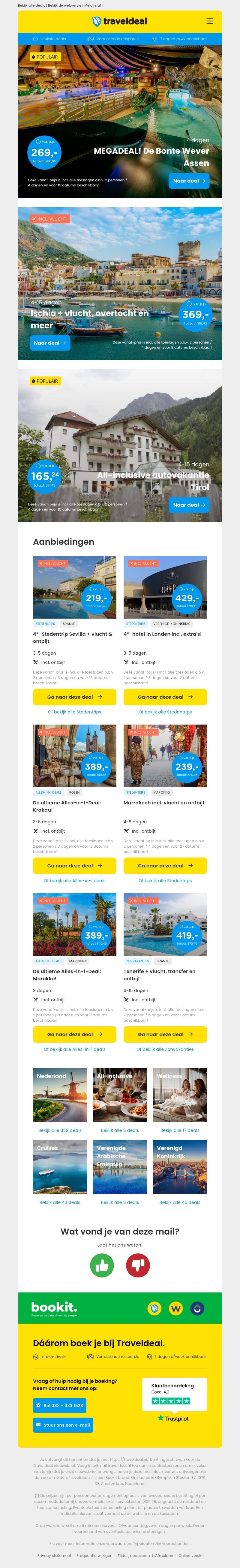Profiteer nu van een geweldige aanbieding bij De Bonte Wever Assen vanaf €269 per persoon. Daarnaast hebben we een fantastische deal voor een reis naar Ischia inclusief vlucht, overtocht en meer vanaf €369 per persoon. Mis ook de all-inclusive autovakantie naar Tirol vanaf €165,24 niet. Bekijk al onze deals en boek vandaag nog!