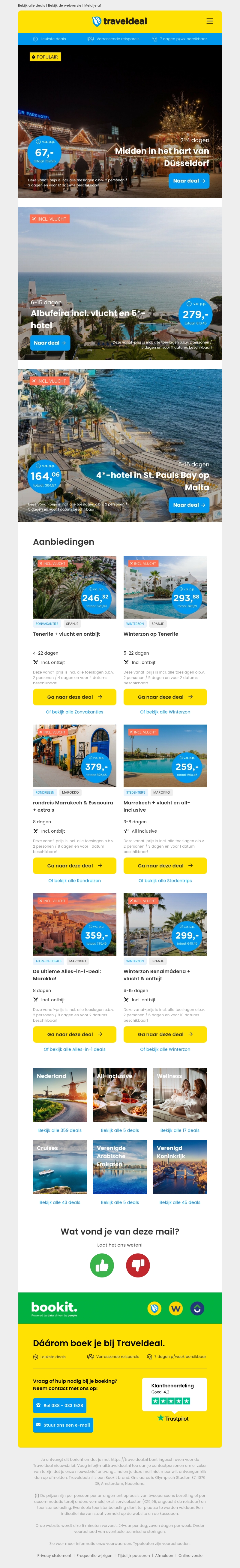 Geniet van een stedentrip in hartje Düsseldorf vanaf slechts €67 per persoon. Voor zonliefhebbers biedt deze nieuwsbrief een luxe vakantie naar Albufeira, inclusief vlucht en verblijf in een 5-sterrenhotel, vanaf €279 per persoon. Grijp je kans op andere geweldige aanbiedingen zoals een strandvakantie in Malta of een all-inclusive verblijf in Marrakech.