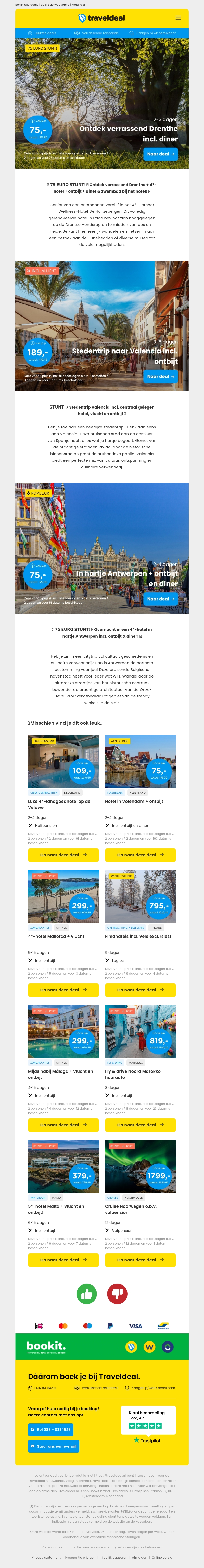Verken bijzondere aanbiedingen en genieten van een stedentrip of natuur met de TravelDeals nieuwsbrief. Ga op avontuur in Drenthe met diner vanaf €75, ontdek Valencia voor slechts €189, of bezoek Antwerpen inclusief diner vanaf €75 per persoon. Boek vandaag nog je volgende avontuur!