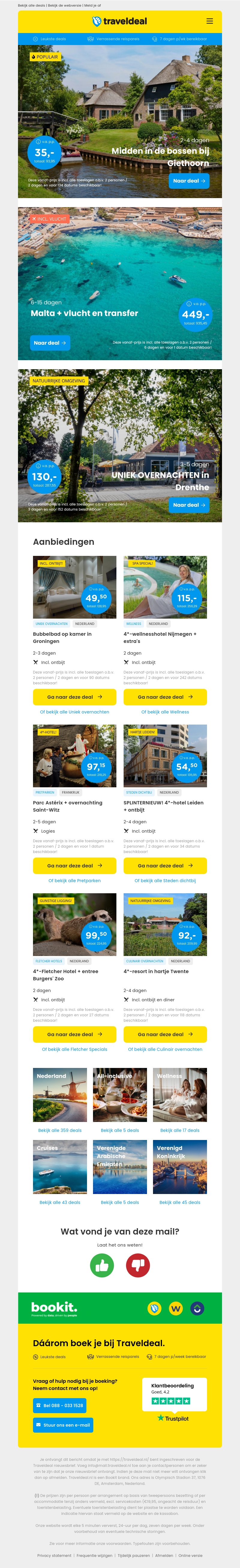 Mis deze geweldige deals bij Traveldeal niet! Verblijf midden in de natuur of geniet van een zonvakantie. Boek bijvoorbeeld Giethoorn vanaf €35 p.p. of Malta inclusief vlucht en transfer vanaf €449 p.p. Bekijk de populaire aanbiedingen en unieke verblijven. Pak deze kans en boek vandaag nog jouw vakantie.