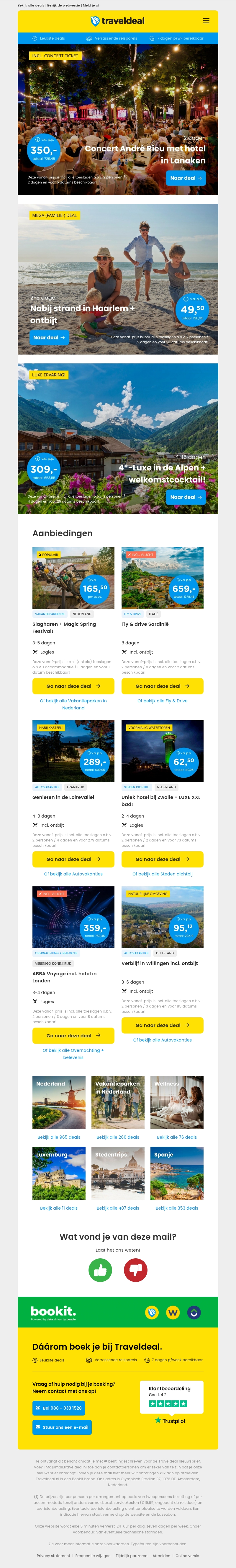 Beleef een magische avond met André Rieu inclusief hotel vanaf 350 euro. Profiteer van een zomerse familiedeal in Haarlem met overnachting en ontbijt vanaf slechts 49,50 euro per persoon. Verken andere aantrekkelijke aanbiedingen zoals luxe in de Alpen of een stadsreis naar Londen.