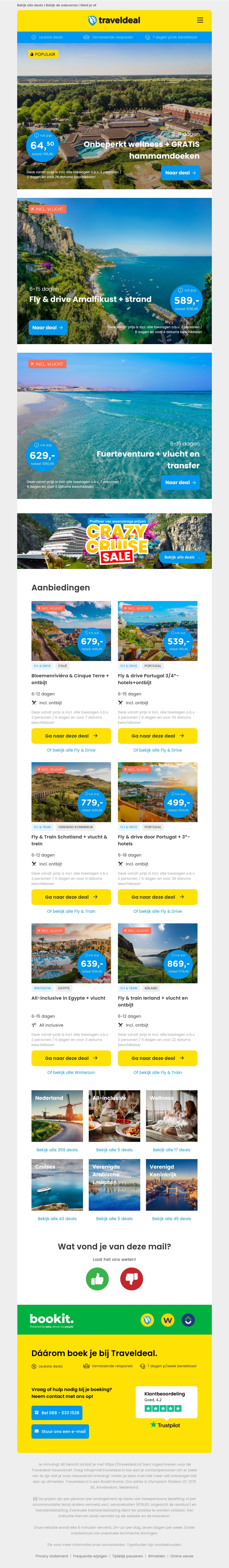 Ontdek exclusieve aanbiedingen bij Traveldeal. Geniet van onbeperkt wellness inclusief gratis hammamdoeken vanaf €64.50 per persoon. Maak een onvergetelijke Fly & drive naar de Amalfikust inclusief strandbezoek vanaf €589 per persoon. Bekijk onze aantrekkelijke aanbiedingen en vind jouw perfecte reis!