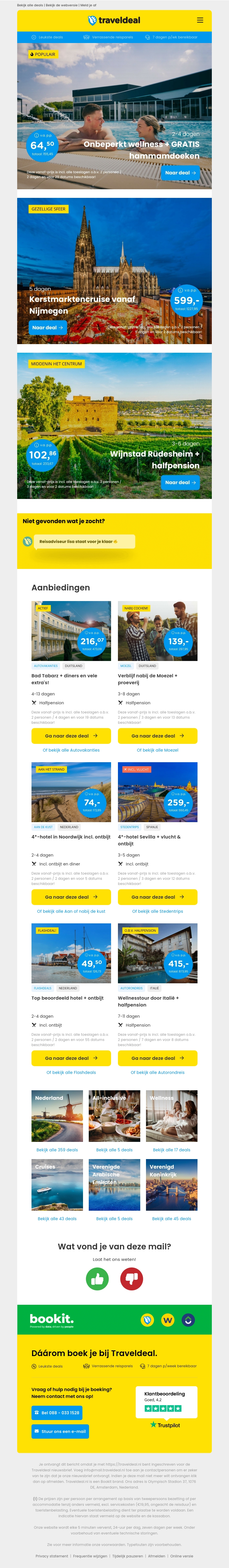 Geniet van onbeperkte wellness inclusief gratis hammamdoeken vanaf slechts €64,50 per persoon. Ontdek ook andere spannende aanbiedingen, zoals een kerstmarkt tour vanuit Nijmegen of een wijnreis naar Rüdesheim. Vergeet niet onze speciale deals met hotelovernachtingen en ontbijt te bekijken.