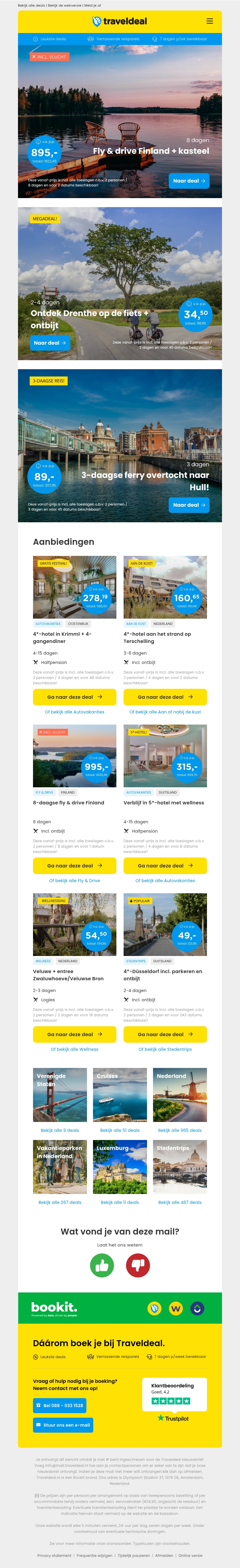 Beleef het avontuur van een 8-daagse fly & drive door Finland inclusief bezoek aan een kasteel al vanaf €895. Ontdek de charme van Drenthe op de fiets met ontbijt voor slechts €34,50 per persoon. Boek nu en profiteer van deze geweldige kortingen!