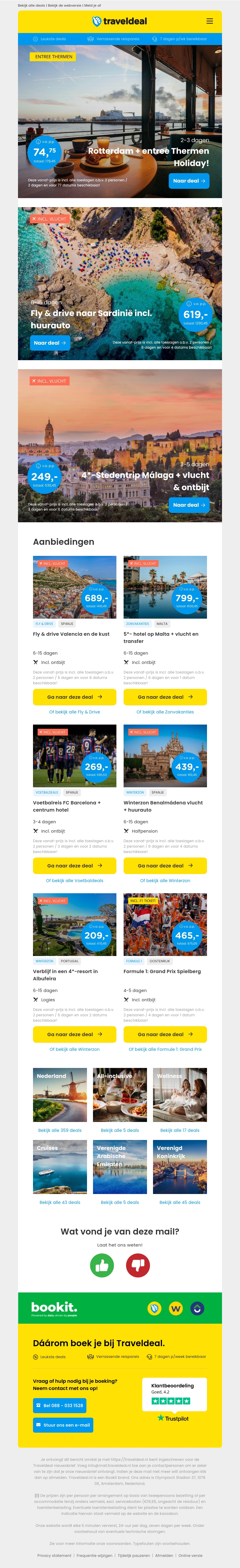 Deze nieuwsbrief van Traveldeal.nl biedt exclusieve deals zoals een verblijf in Rotterdam met entree tot Thermen Holiday vanaf €74.75 per persoon. Daarnaast zijn er nog meer aantrekkelijke aanbiedingen zoals stedentrips naar Málaga, fly & drive naar Sardinië, en nog veel meer.