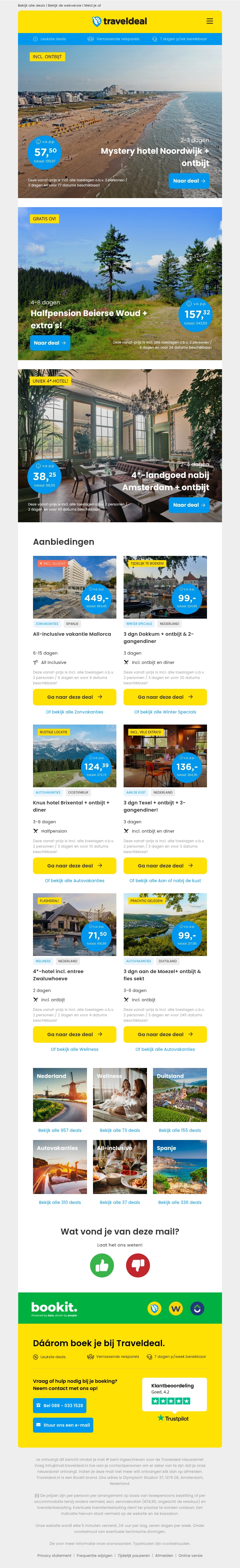 Beleef een luxe verblijf in een 4-sterren mystery hotel in Noordwijk met ontbijt vanaf slechts €57,50 p.p. Verken het prachtige Beierse Woud met een 4-daagse vakantie inclusief halfpension en extra's vanaf €158,- p.p. Boek nu en geniet van unieke aanbiedingen!