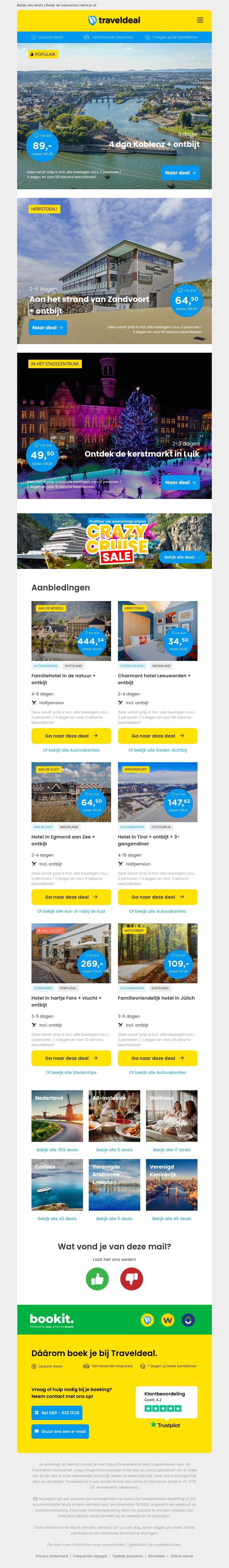 Ontdek prachtige steden zoals Koblenz, en geniet van herfstspecials aan het strand van Zandvoort. Bezoek de sfeervolle kerstmarkt in Luik en profiteer van de Crazy Cruise Sale. Bekijk nu alle aanbiedingen en plan jouw volgende uitje voordelig.