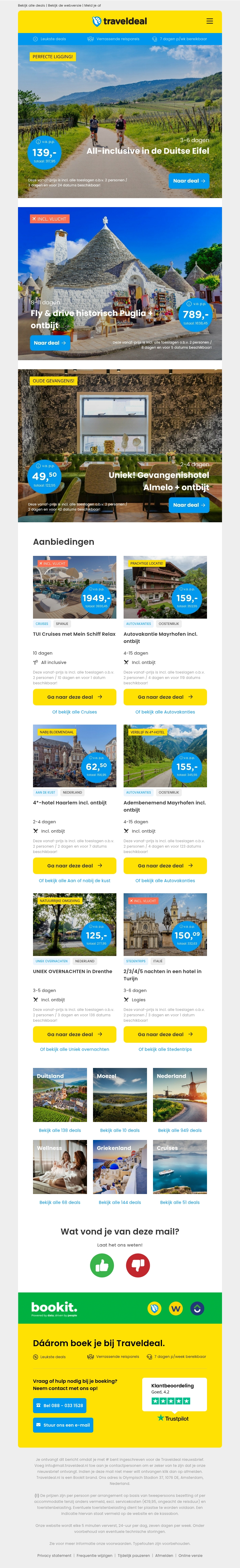 Profiteer van een super deal in de prachtige Eifel met een 3-daags all-inclusive verblijf vanaf slechts €139. Of ontdek het historische Puglia met een 8-daagse fly & drive vanaf €789 p.p. Travaldeal biedt jou de kans om onvergetelijke ervaringen op te doen tegen de beste prijzen.