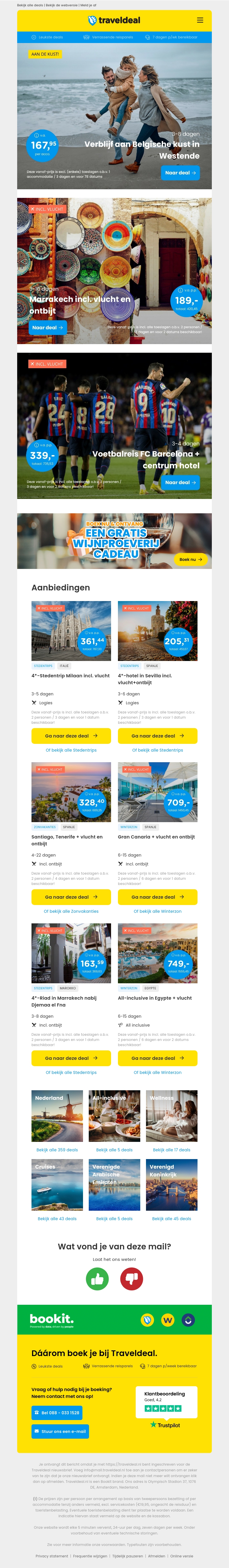 Geniet van een verblijf aan de Belgische kust in Westende vanaf €167,95 per accommodatie. Of kies voor een exotische reis naar Marrakech inclusief vlucht en ontbijt vanaf €189 per persoon. Ontdek meer aanbiedingen en gratis cadeaus voor jouw volgende vakantie.