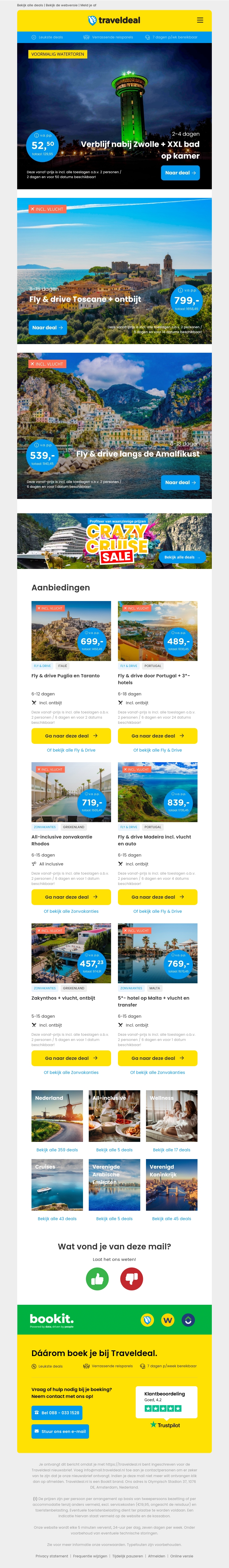 Ontdek verblijven nabij Zwolle met een XXL bad op je kamer voor slechts €52,50 per persoon. Geniet van een Fly & Drive vakantie naar Toscane inclusief ontbijt vanaf €799 per persoon. Andere spannende aanbiedingen zijn Fly & Drive langs de Amalfikust, Puglia en Taranto en een crazy cruise sale. Mis deze geweldige deals niet!