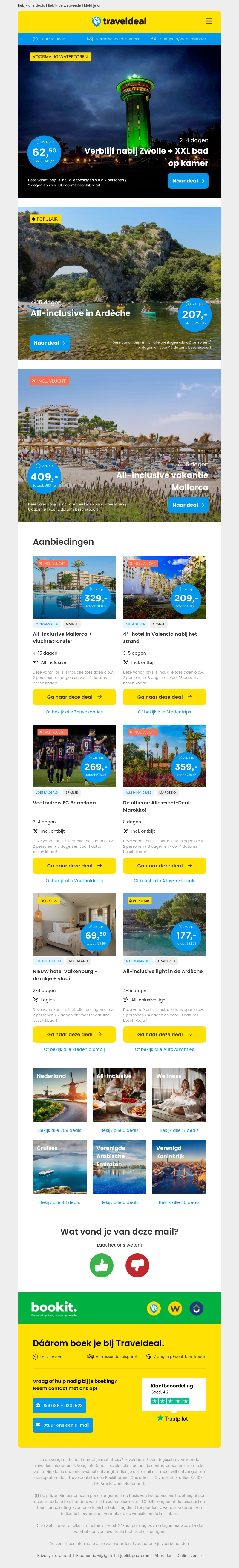 Boek een verblijf nabij Zwolle inclusief een XXL bad op de kamer vanaf €62.50 per persoon. Geniet van een all-inclusive ervaring in Ardèche vanaf €207 per persoon. Ontdek ook andere aantrekkelijke aanbiedingen zoals een vakantie in Mallorca, voetbalreis naar FC Barcelona en nieuwe hotels in Nederland.