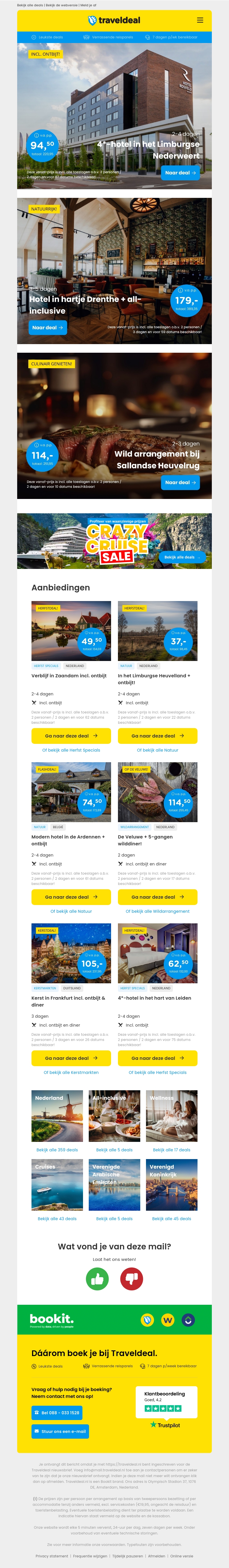 Bezoek een luxe 4* hotel in Limburgs Nederweert of kies voor een all-inclusive verblijf in hartje Drenthe. Geniet van een wildarrangement bij Sallandse Heuvelrug of vaar mee met onze Crazy Cruise Sale. Onze aanbiedingen variëren vanaf €37 per persoon voor een ontspannen herfstuitje.