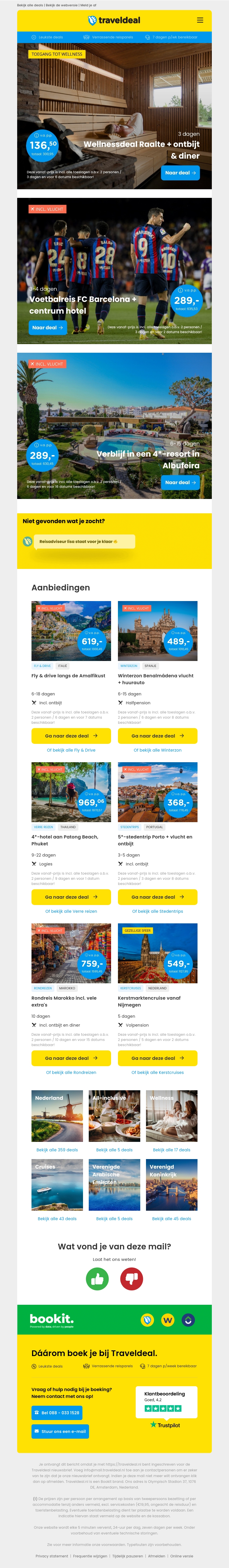 Deze nieuwsbrief van Traveldeals brengt je de beste wellnessdeals, spannende voetbalreizen en zonnige winterbestemmingen. Geniet van een wellness retreat inclusief ontbijt en diner, verblijf bij FC Barcelona, of relax in een 4-sterren resort in Albufeira. Mis deze geweldige aanbiedingen niet!