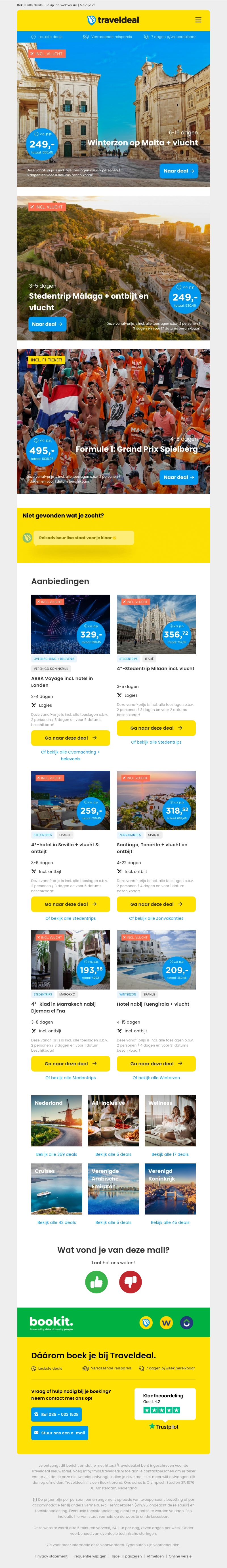 Beleef de winterzon op Malta of ontdek de charme van Málaga met onze exclusieve stedentrip deals. Of geniet van de spanning van de Formule 1 Grand Prix in Spielberg. Ontdek meer aanbiedingen zoals verblijven in Sevilla, Tenerife en Marrakech. Mis deze kans niet om te profiteren van geweldige deals en ervaar unieke vakanties.