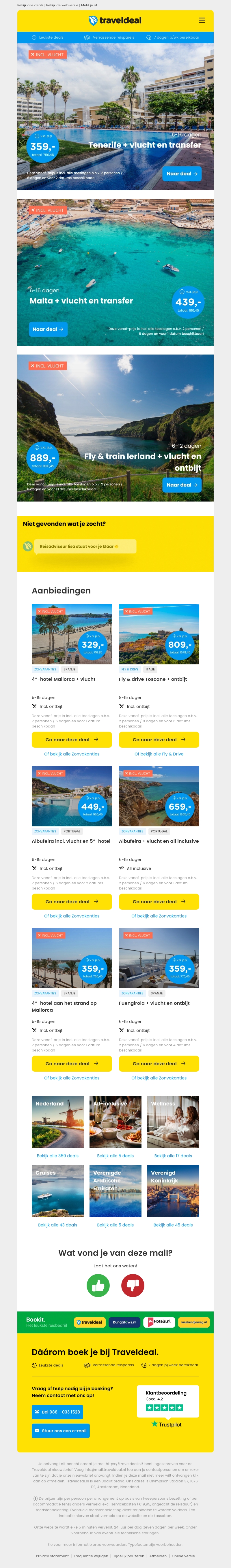 Ontsnap naar de zon met onze geweldige vakantieaanbiedingen! Geniet van een complete ervaring inclusief vliegtickets, hotelovernachtingen en transfers. Kies voor bestemmingen zoals Tenerife, Malta, Ierland en meer. Boek nu jouw perfecte vakantie met Traveldeal en profiteer van fantastische kortingen!