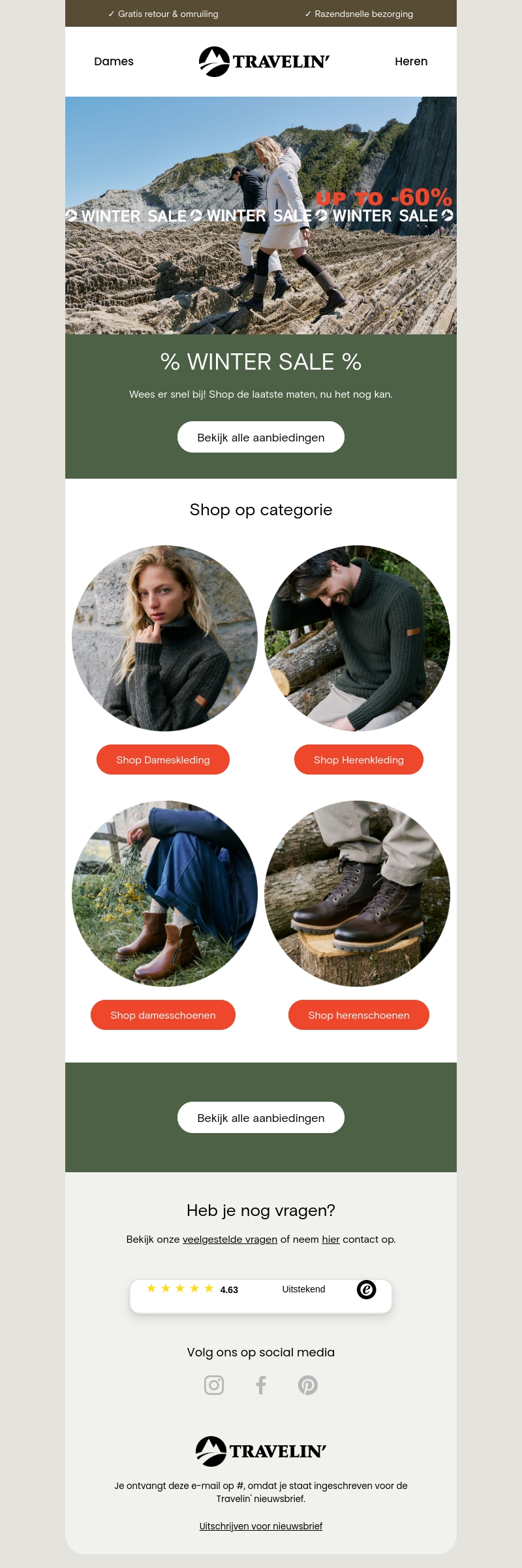 De Winter Sale gaat door bij Travelin’ met kortingen tot wel 60%! Shop de nieuwste modetrends voor dames en heren, inclusief schoenen en accessoires. Profiteer snel van deze geweldige aanbiedingen voordat ze op zijn.