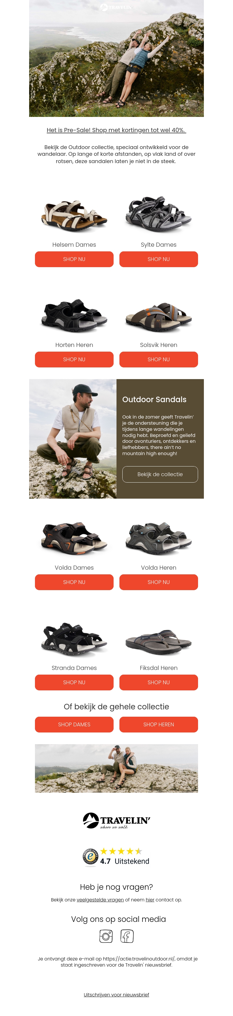 Het is Pre-Sale bij Travellin' met kortingen tot wel -40%! Ontdek de Outdoor collectie, speciaal ontwikkeld voor de wandelaar. Perfect voor lange afstanden, vlak land of rotsige terreinen.