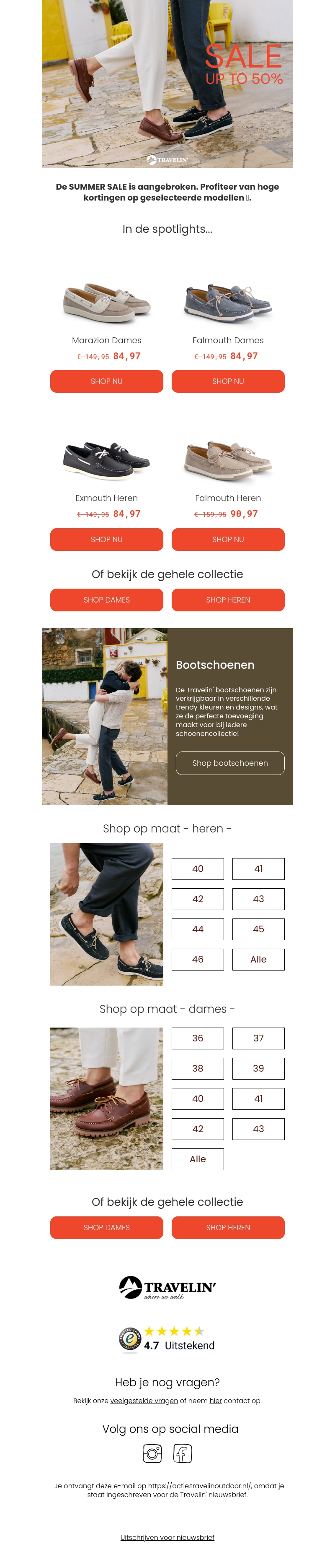 De SUMMER SALE is aangebroken bij Travelin'. Profiteer van hoge kortingen tot wel 50% op geselecteerde modellen. Ontdek de Marazion Dames, Falmouth Dames, Exmouth Heren en Falmouth Heren schoenen. Shop op maat en bekijk de hele collectie.