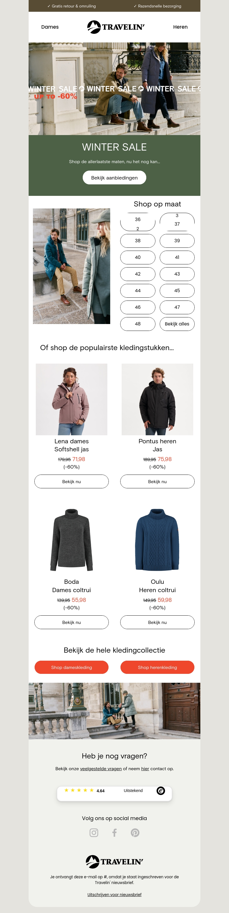 Bekijk de spectaculaire winteraanbiedingen bij Travelin'. Profiteer van kortingen tot 60% op dames- en herenkleding. Of je nu op zoek bent naar stijlvolle jassen of comfortabele truien, er is voor ieder wat wils. Mis deze kans niet om je wintergarderobe voordelig aan te vullen. Bezoek onze site voor meer informatie en om je favoriete stukken te ontdekken.