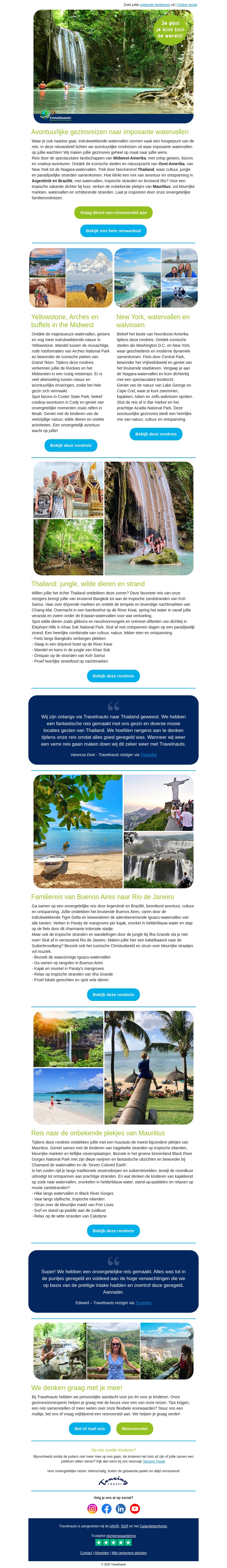 Beleef avontuurlijke familiereizen naar enkele van de meest imposante watervallen ter wereld. Van de jungles in Thailand tot de wilde natuur in de VS, er is voor ieder wat wils. Ontdek de schoonheid en cultuur van unieke reisbestemmingen.