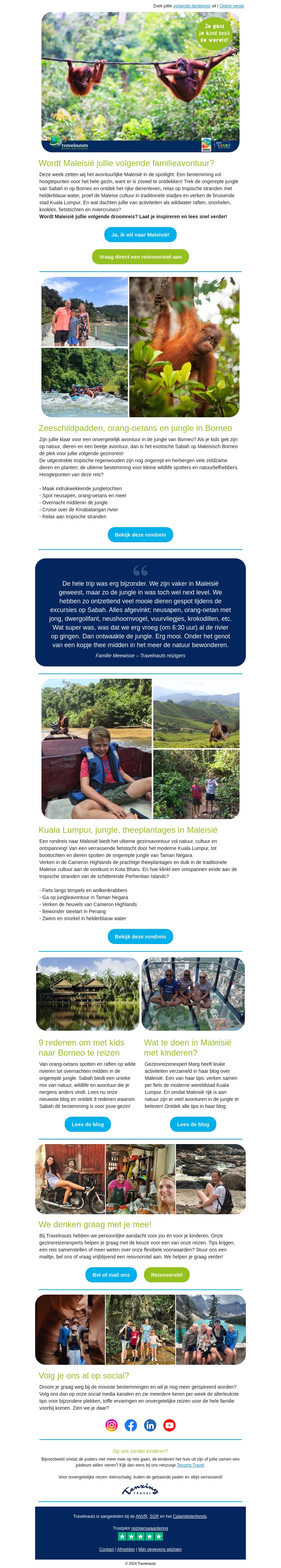 Deze nieuwsbrief neemt je mee naar Maleisië, een perfecte bestemming voor jullie volgende familieavontuur. Ervaar de jungle, ontmoet orang-oetans, en geniet van prachtige stranden. Bezoek Kuala Lumpur en kom tot rust in een van de vele nationale parken. Lees verder voor meer informatie en start met plannen!