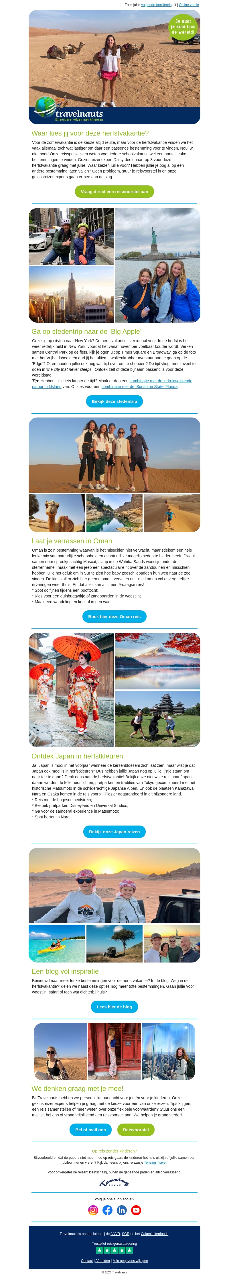 Waar ga jij naar toe deze herfstvakantie? Kies uit onze top bestemmingen zoals New York, Oman, en Japan. Geniet van stedentrips, avontuurlijke exploraties, en unieke culturele ervaringen met Travelnauts.