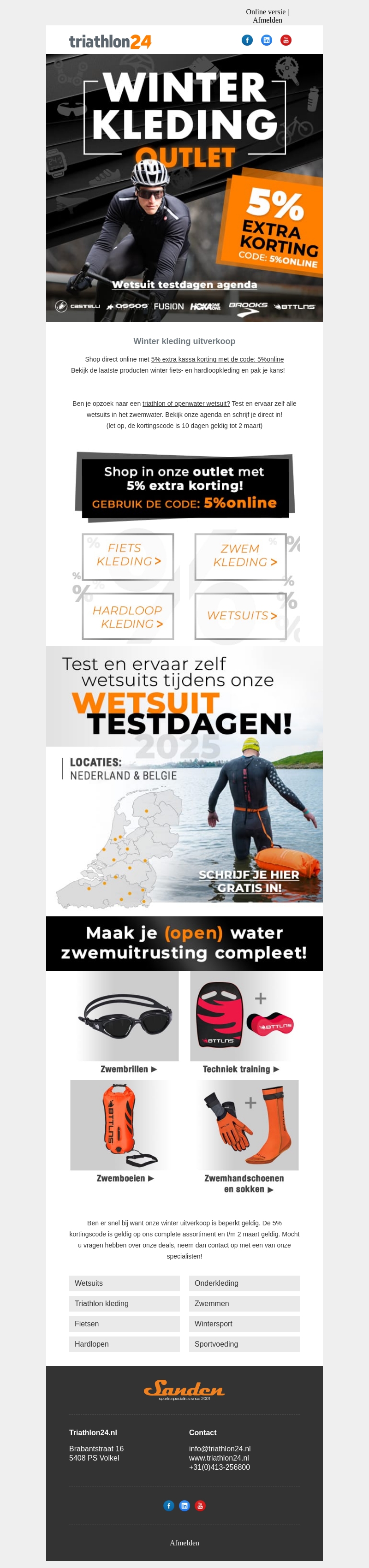 Profiteer van de laatste uitverkoopproducten in onze winterkleding outlet met een extra korting van 5% bij Triathlon24. Ontdek ons assortiment fiets- en hardloopkleding en bereid je voor op de komende seizoenen. Gebruik de kortingscode 5%online om van de aanbieding te profiteren. Deze actie is geldig tot 2 maart. Mis het niet en shop nu online voor de beste deals!