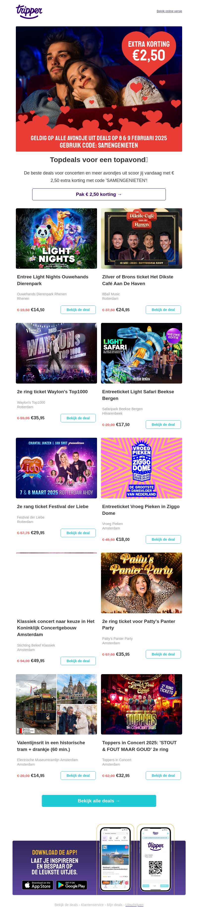 Beleef een fantastische avond uit met extra korting! Gebruik de kortingscode 'SAMENGENIETEN' voor €2,50 extra korting op geselecteerde deals voor concerten, festivals en meer. Ontdek topdeals zoals het ‘Festival der Liebe’ en ‘Valentijnsrit in een historische tram’. Geniet van onvergetelijke ervaringen met vrienden of een geliefde.