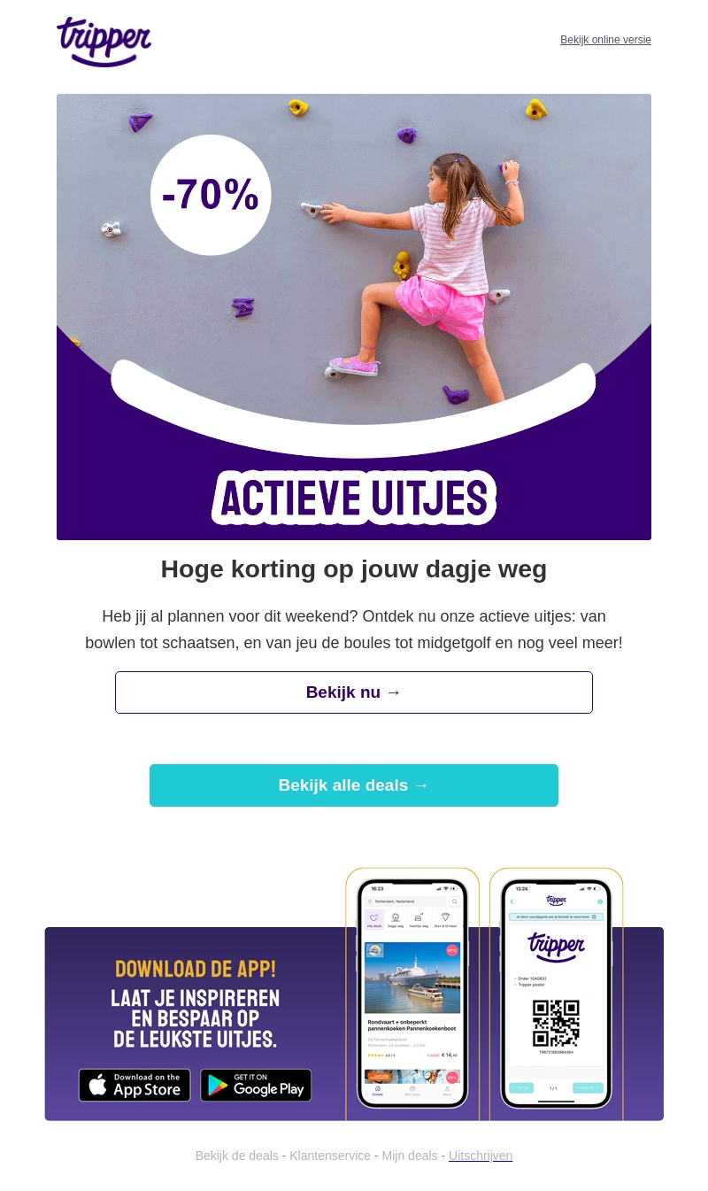 Heb jij al plannen voor dit weekend? Ontdek nu onze actieve uitjes met kortingen tot 70%! Van bowlen tot schaatsen en nog veel meer, er is voor ieder wat wils. Mis deze kans niet om te genieten van een dagje weg met ongeëvenaarde voordelen. Bekijk nu al onze fantastische deals en laat je verrassen!