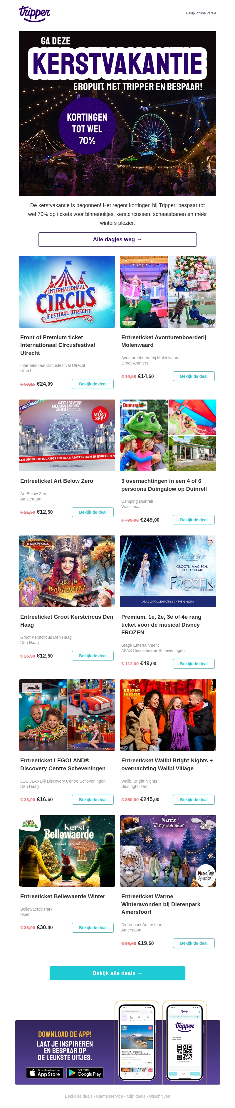 Geniet deze kerstvakantie van geweldige uitjes met Tripper. Bespaar tot wel 70% op tickets voor onder andere circussen, schaatsbanen en musicals. Of je nu op zoek bent naar avontuur of ontspanning, bij Tripper vind je het perfecte winteruitje. Ontdek alle aanbiedingen voor een onvergetelijke kerstvakantie.