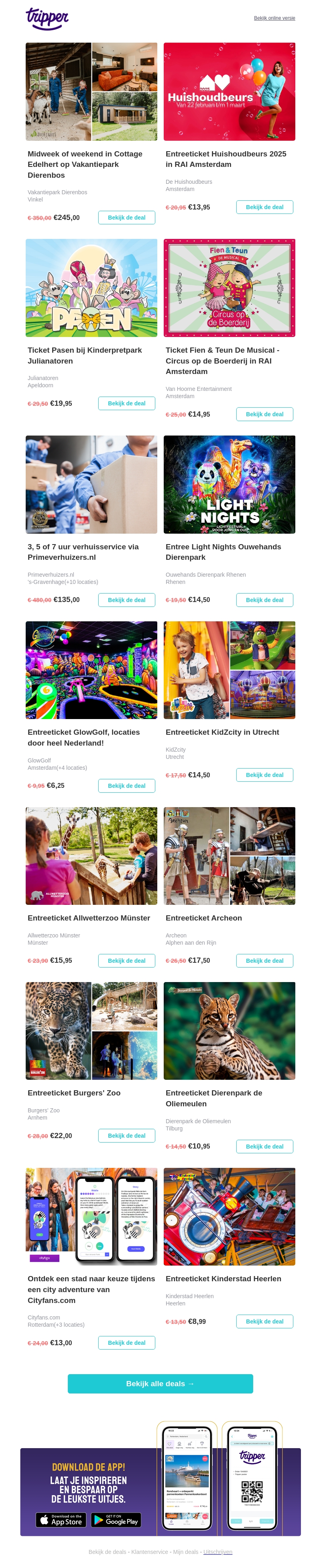 Tripper biedt je een breed scala aan aanbiedingen voor spannende uitstapjes. Van een verblijf in Cottage Edelhert tot tickets voor de Huishoudbeurs in Amsterdam. Geniet van kortingen op leuke dagjes uit naar dierentuinen, attractieparken en avondvermaak. Kijk ook naar bijzondere deals zoals Light Nights in Ouwehands Dierenpark en city adventures van Cityfans.com. Bekijk alle spannende aanbiedingen en plan je volgende avontuur vandaag nog.