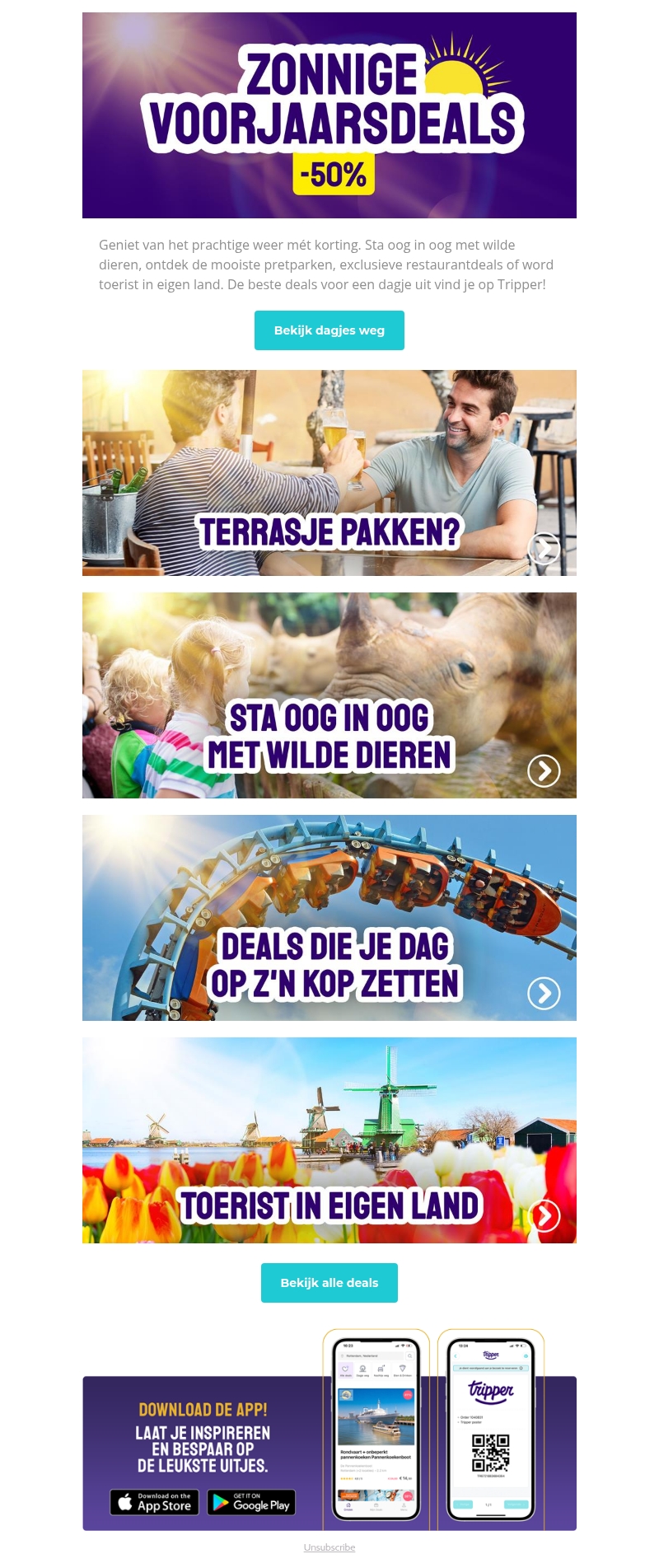 Profiteer van zonnige voorjaarsdeals met 50% korting! Ontdek wilde dieren, geniet van pretparken en culinaire hoogstandjes. Vergelijk de beste deals voor een dagje uit met Tripper. Word toerist in eigen land en ontdek verrassende plekken.