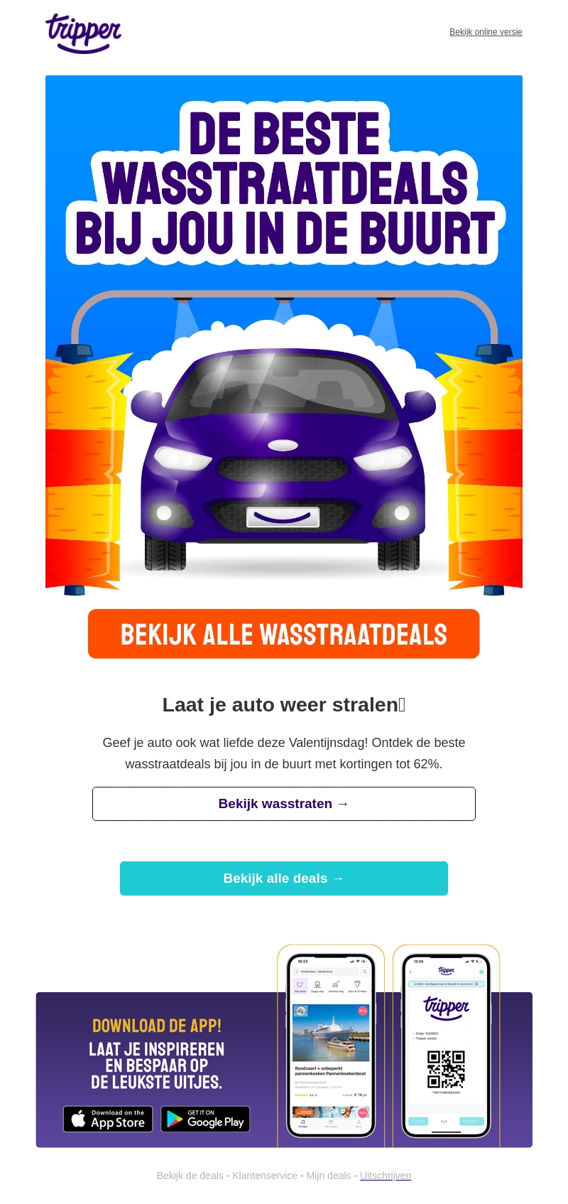 Deze Valentijnsdag krijgt niet alleen jij de liefde, maar ook je auto. Maak gebruik van geweldige wasstraatdeals bij jou in de buurt en laat je auto weer stralen. Profiteer van kortingen tot wel 62% en ontdek hoe je je auto de verzorging kunt geven die het verdient.