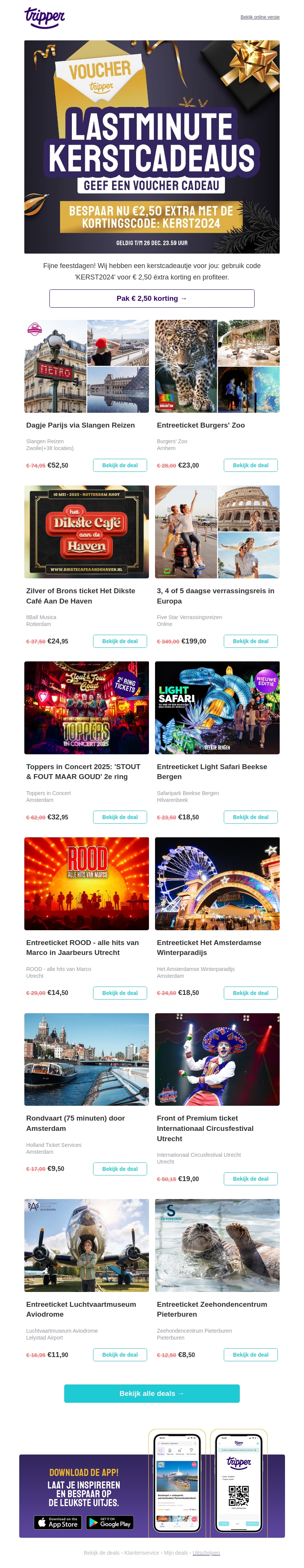 Geef een speciaal cadeau deze kerst met Tripper's last-minute aanbiedingen! Profiteer van unieke deals op dagjes uit, concerten, en meer. Gebruik de code 'KERST2024' en krijg €2,50 extra korting op je aankoop. Mis deze kans niet om geweldige ervaringen te delen met vrienden en familie. Bekijk nu alle deals en kies het perfecte kerstcadeau! Deze aanbieding is geldig tot en met 28 december.