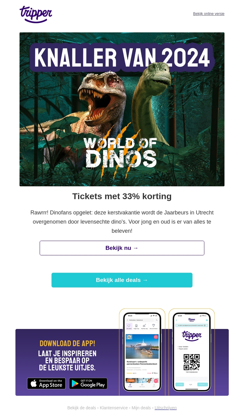 Deze kerstvakantie wordt de Jaarbeurs in Utrecht omgetoverd tot een wereld vol levensechte dinosaurussen. Geniet van een spannend uitje voor jong en oud met 33% korting op de tickets. Mis deze unieke kans niet om de prehistorie te herontdekken!