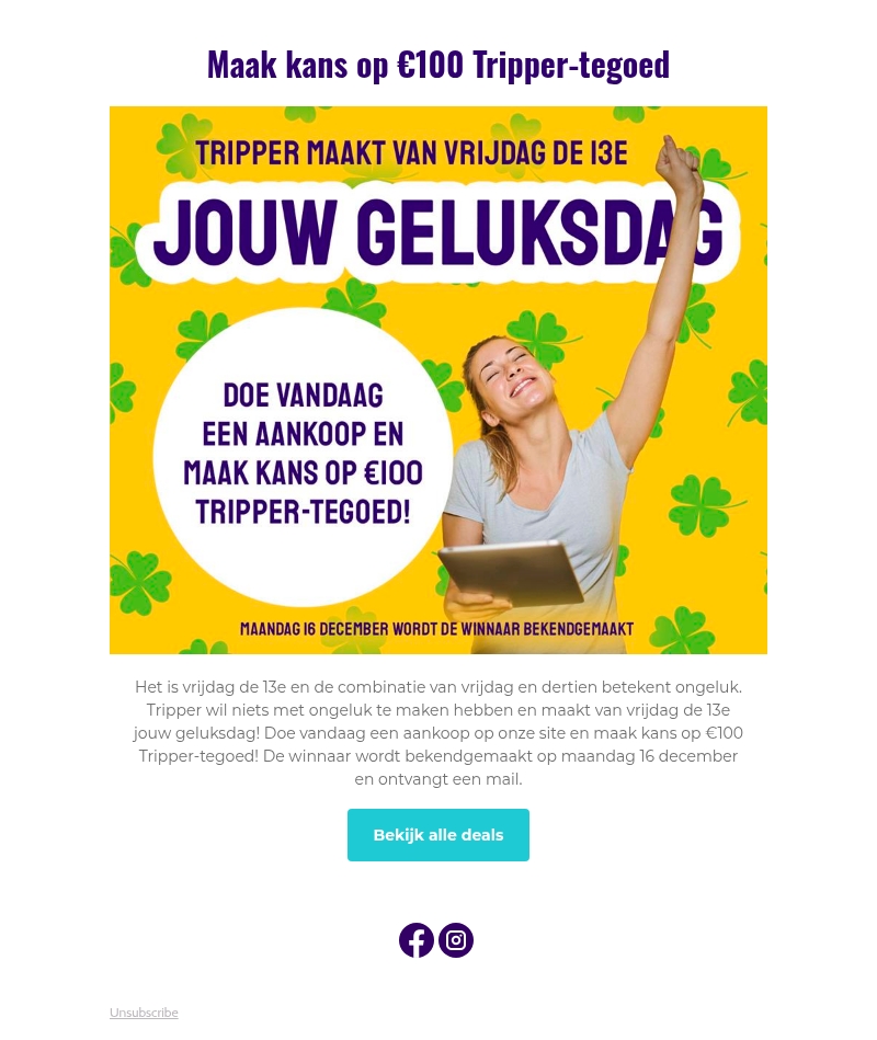 Tripper maakt van vrijdag de 13e jouw geluksdag! Doe vandaag nog een aankoop en maak kans op €100 Tripper-tegoed. De winnaar wordt bekendgemaakt op maandag 16 december en ontvangt een mail. Mis deze kans niet om je geluk te beproeven en geweldige aanbiedingen te ontdekken.