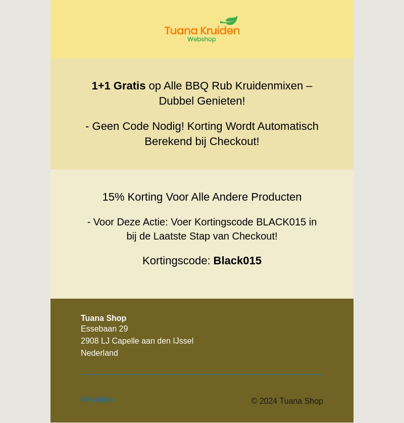 Geniet van dubbele besparingen bij Tuana Kruiden Webshop! Ontvang 1+1 gratis op alle BBQ Rub Kruidenmixen zonder dat een code nodig is. Bovendien krijg je 15% korting op alle andere producten met de code BLACK015. Zorg ervoor dat je deze kortingscode invoert bij de laatste stap van je checkout.
