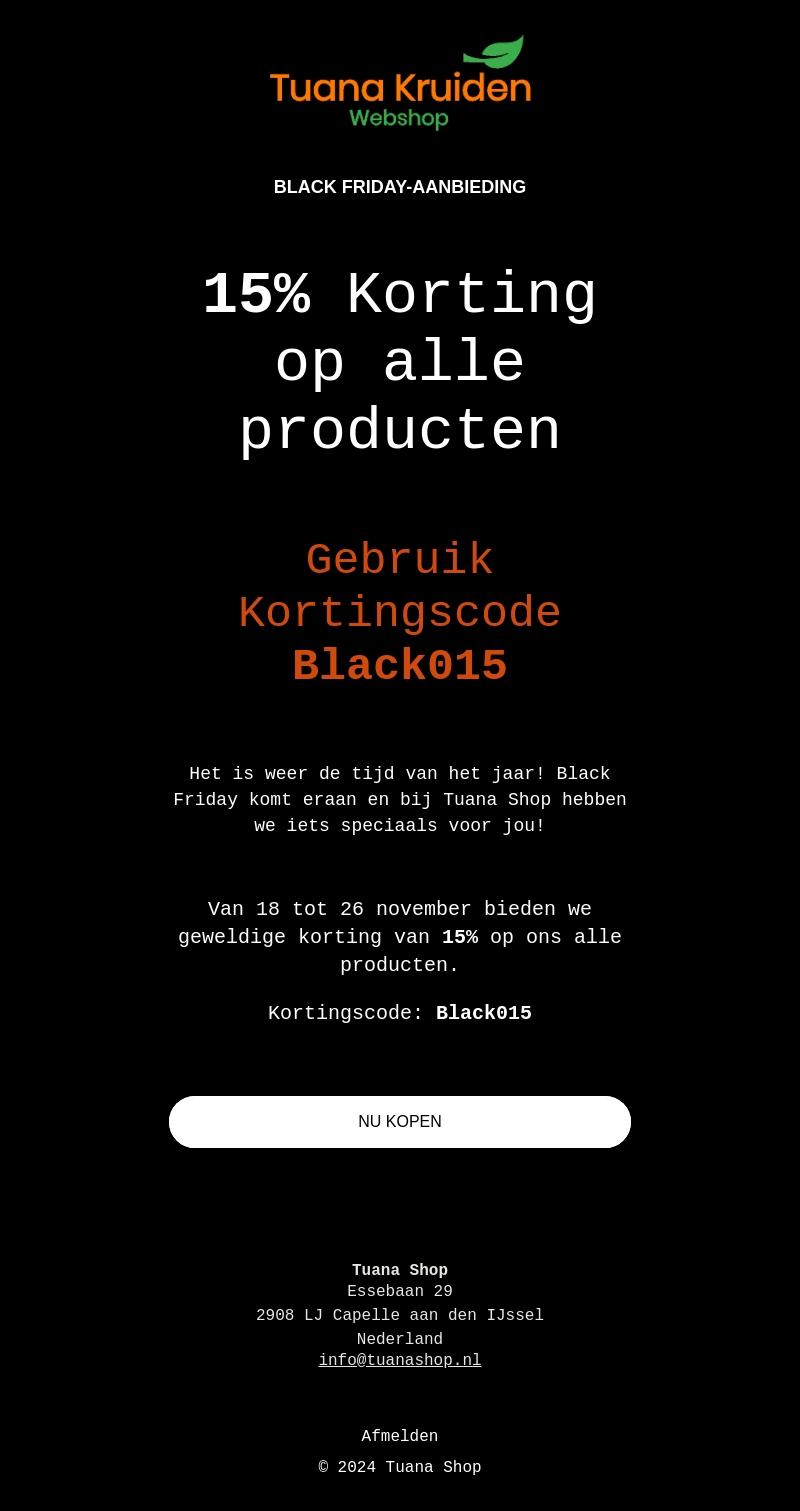 Black Friday is dé tijd om te besparen bij Tuana Shop! Ontvang van 18 tot 26 november een korting van 15% op ons volledige assortiment. Gebruik de kortingscode Black015 om te profiteren van deze geweldige aanbieding. Mis het niet!