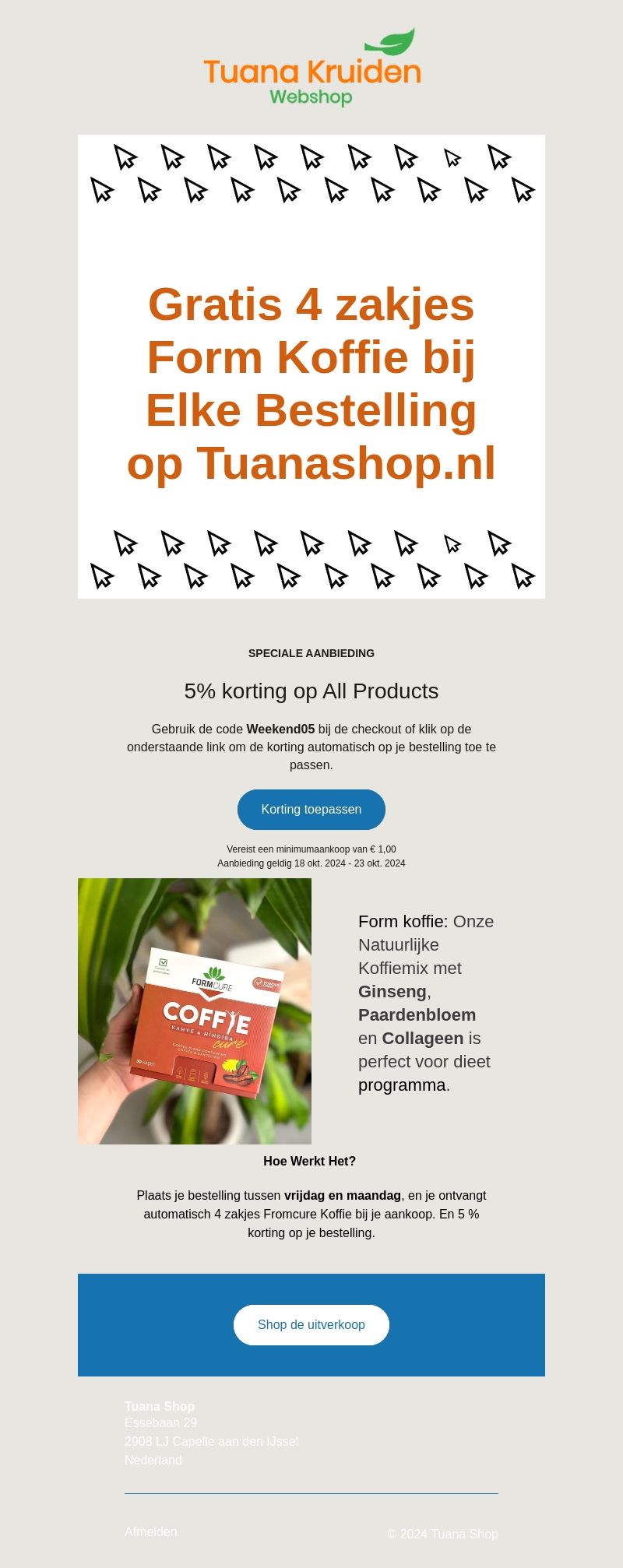 Bij elke bestelling bij Tuana Shop ontvang je vier gratis zakjes Form Koffie. Profiteer daarnaast van 5% korting op alle producten. Gebruik de code Weekend05 bij de checkout. Deze aanbieding geldt vanaf 18 oktober tot 23 oktober 2024. Mis deze kans niet om van natuurlijke koffiemixen met ginseng en collageen te genieten.