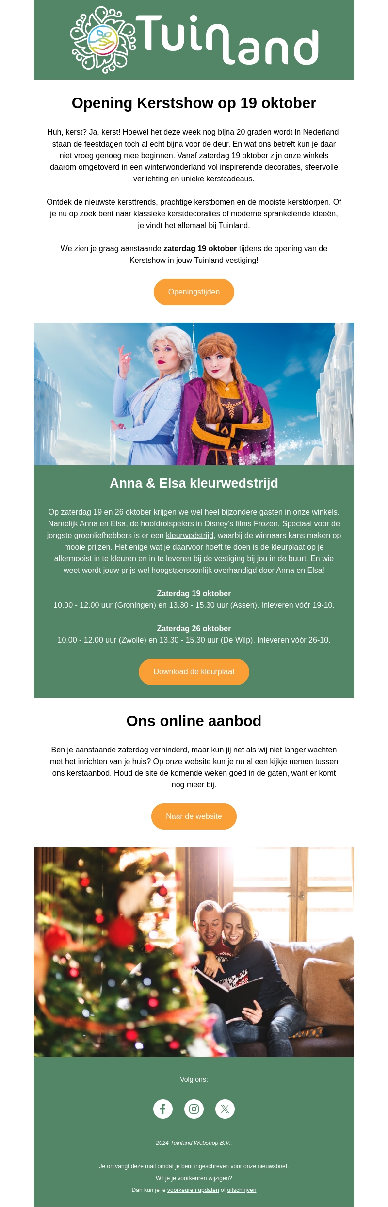 De feestdagen staan voor de deur en Tuinland trapt af met een spectaculaire Kerstshow op 19 oktober. Transformeer jouw winter met inspirerende decoraties en unieke cadeaus. Bovendien nodigen Anna en Elsa alle kleintjes uit voor een speciale kleurwedstrijd. Ontdek alles in jouw lokale Tuinland vestiging of bezoek ons online.