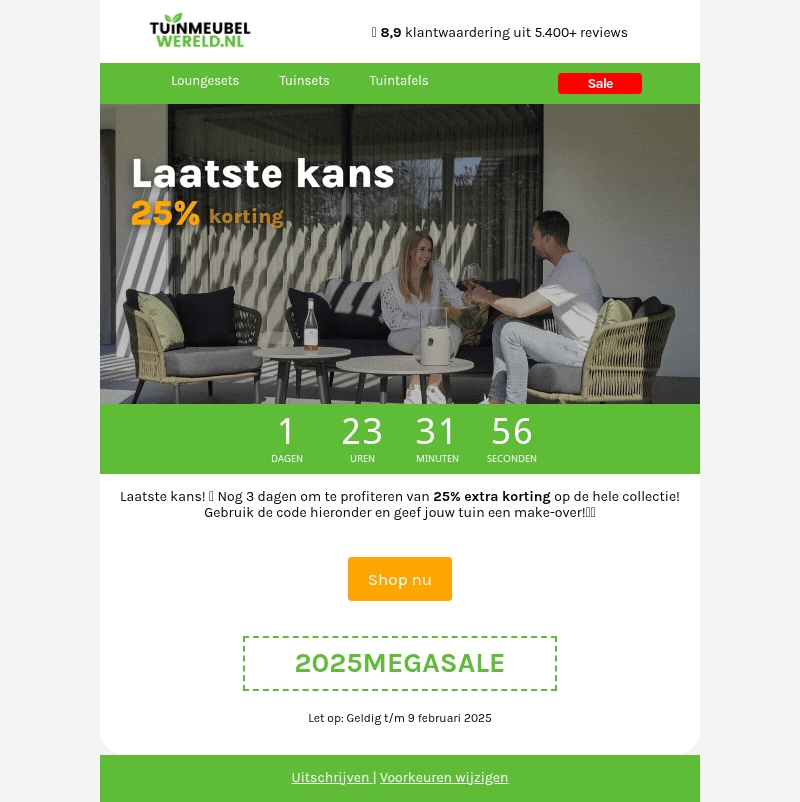 Grijp je kans bij Tuinmeubelwereld.nl met een prachtige 25% korting op de hele collectie. Met slechts drie dagen te gaan, is het nu het moment om je tuin een verfrissende make-over te geven. Gebruik de unieke kortingscode om te profiteren van deze geweldige deal. Mis deze mogelijkheid niet om jouw buitenruimte te transformeren tegen een gereduceerde prijs. Lees verder voor meer details over deze speciale aanbieding.